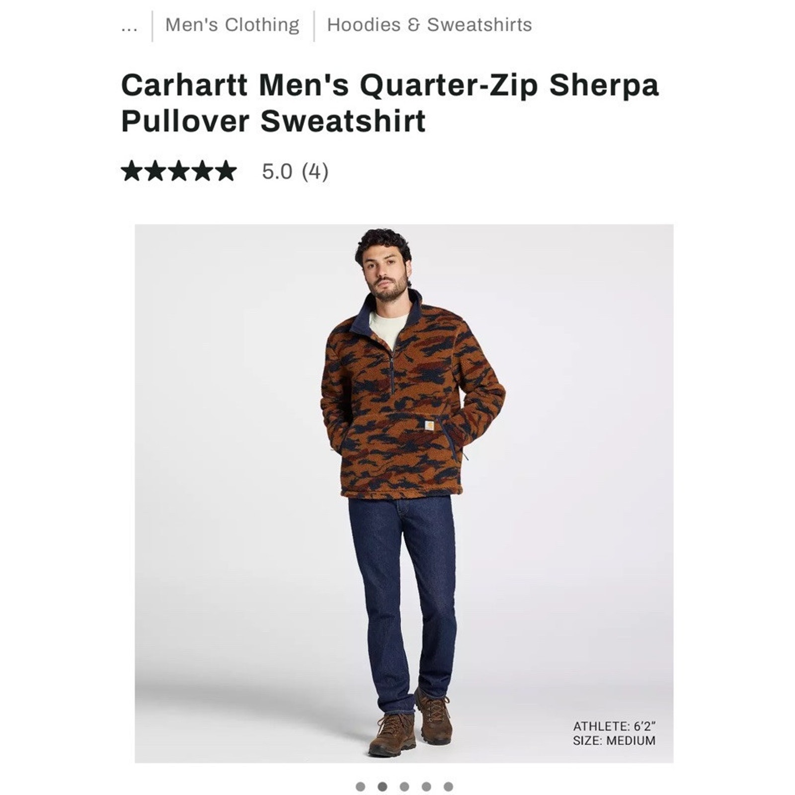 Elevate your casual style with this Carhartt Quarter Zip Pullover Sherpa in brown camouflage. This sweatshirt features a relaxed fit and is made of soft fleece fabric, making it perfect for the fall and winter seasons. It also includes accents such as the Carhartt logo and pockets for added convenience.