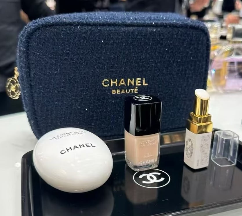 - 1 Chanel blue makeup pouch with camellia charm on zipper pull