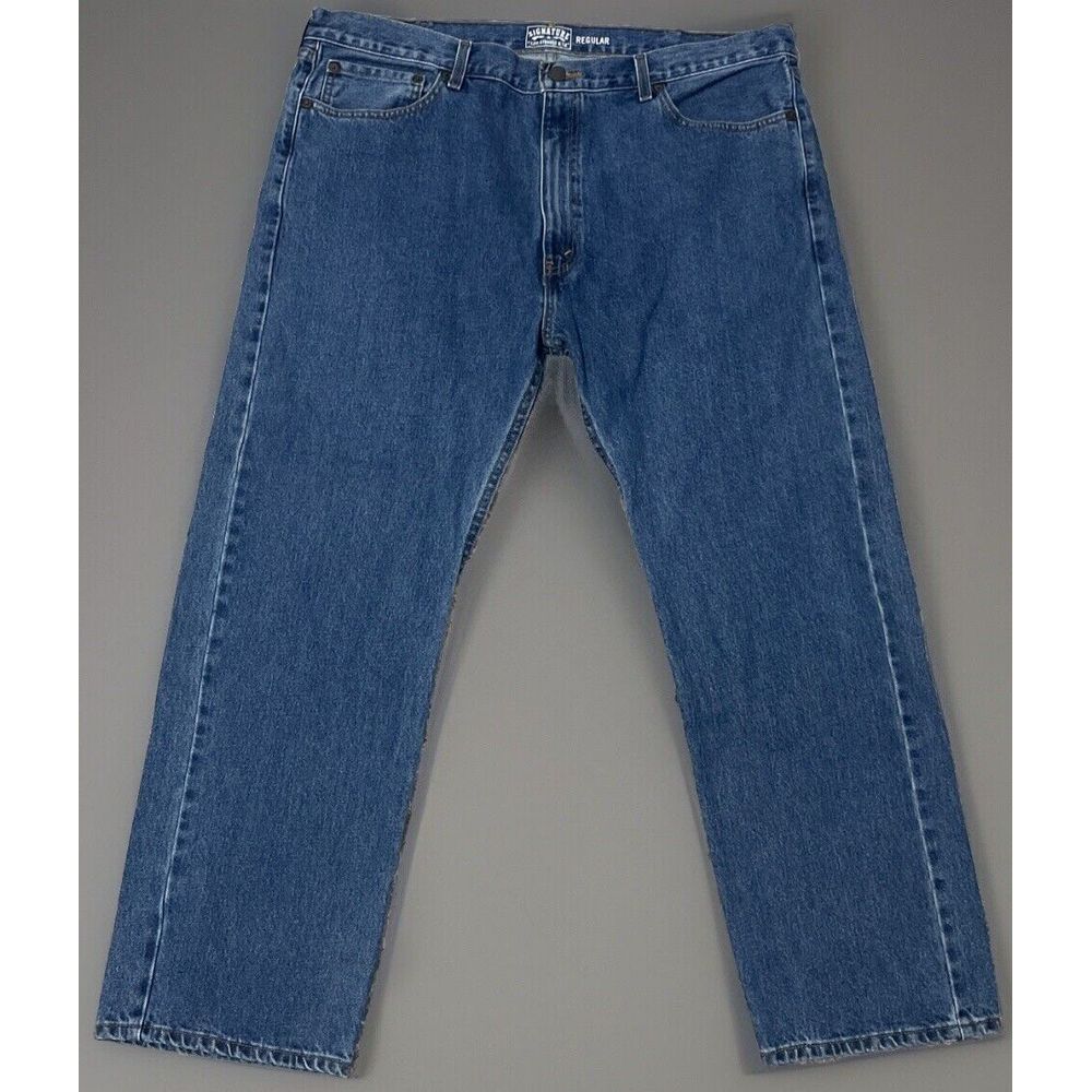 Elevate your denim game with these Levi'sSignature jeans in a deep blue wash. The regular fit style features a zip and button closure, with accents including a logo and zipper. Made from 100% cotton denim, these jeans are perfect for any casual occasion and are sure to become a wardrobe staple. The waist size is 42 inches and the inseam is 30 inches, making them an ideal fit for the modern man. These jeans are not just stylish but also comfortable to wear, making them a great addition to your wardrobe.