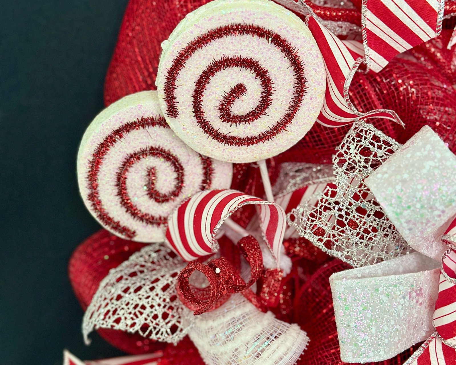 Handmade peppermint candy cane Christmas wreath in a classic red and white holiday theme. This full, festive wreath features deco mesh, glittered peppermint candies, striped ribbon bows, and shimmering white accents for a true candy-shop look. Perfect for front doors, entryways, kitchens, or holiday gifting.